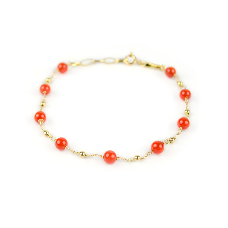 Bracciale donna in oro giallo 750, con corallo rosso mediterraneo di 4,5 mm e palline in oro giallo