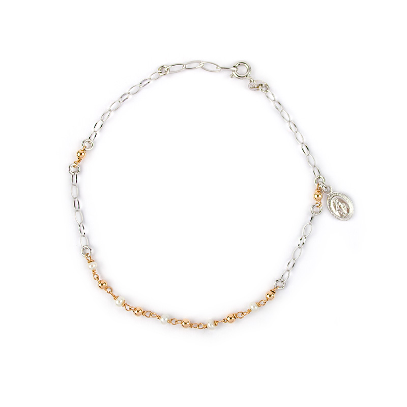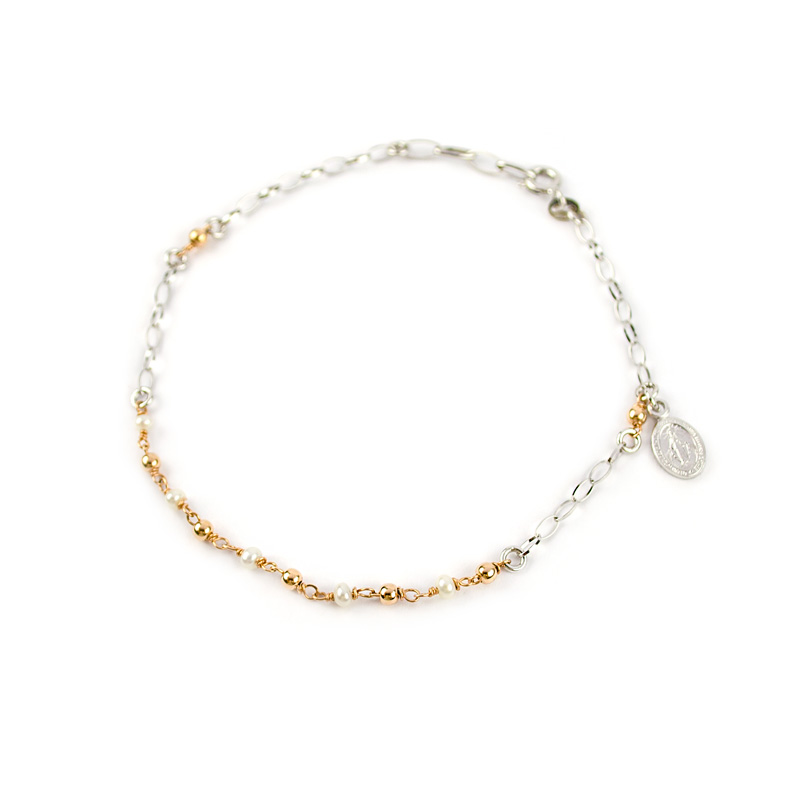 Bracciale rosario donna e bambina in oro bianco 750, con madonna miracolosa pendente, palline in oro rosè lucide alternate da perle coltivate in acqua dolce; catena rolò ovale sottile