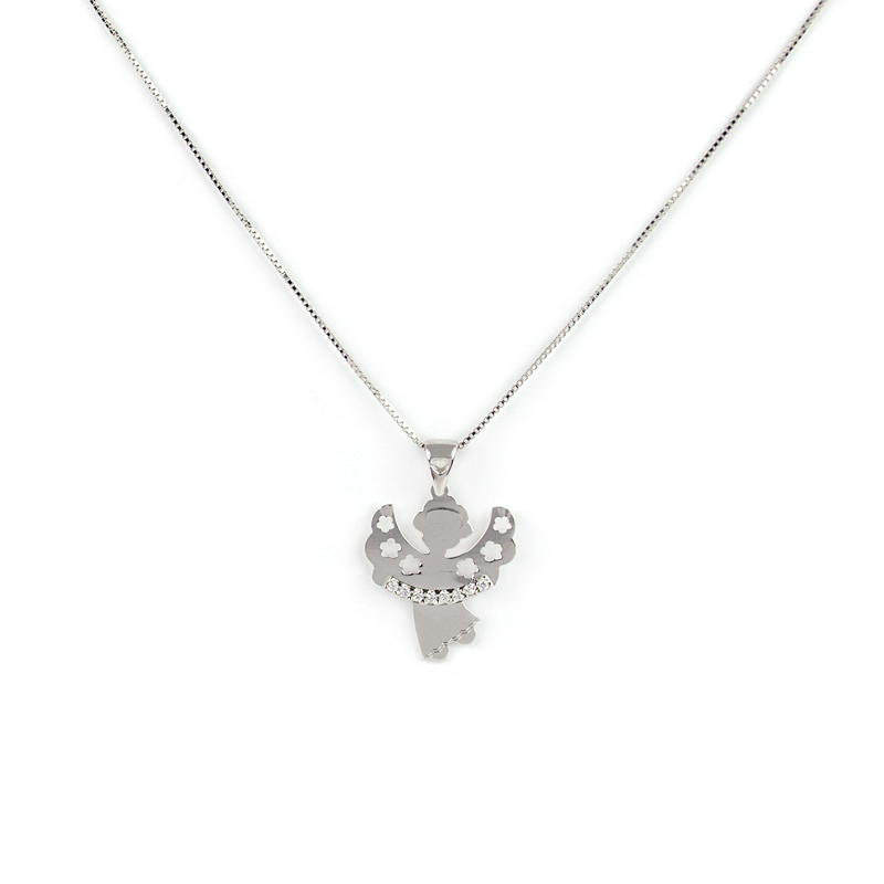 Collana girocollo in oro bianco tit 750 (18 kt), con ciondolo angelo con zirconi; dimensione ciondolo 1,5 x 2 cm