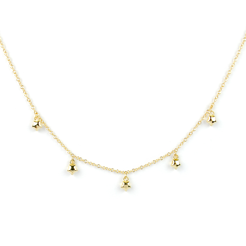 Collana girocollo donna in oro giallo tit 750 (18 kt), con cinque stelline di 4 mm, bombate e lucide, pendenti; catena rolò tonda massiccia