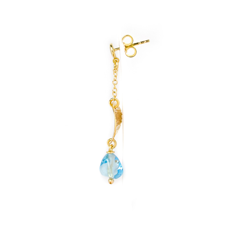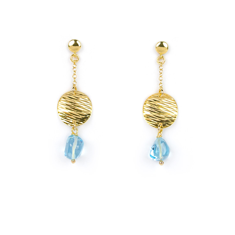 Orecchini perno e farfallina pendenti in oro giallo tit 750 (18 kt) con topazio azzurro di 6×9 mm e disco in oro giallo di 12 mm