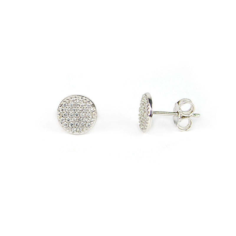 Orecchini perno e farfallina in oro bianco tit 750 (18 kt) tondi e concavi con pavé di zirconi, diametro 8,20 mm